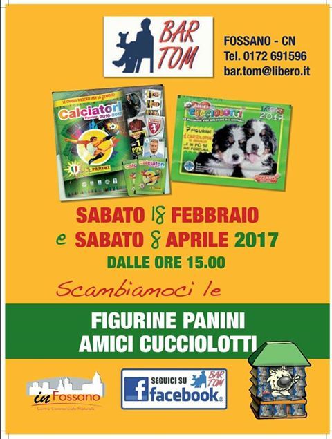 È ormai diventata una tradizione quella dello scambio di figurine al Bar Tom di via Circonvallazione 7 a Fossano. Per il terzo anno consecutivo gli appassionati di Calciatori Panini e Amici Cucciolotti potranno ritrovarsi liberamente nei locali del bar per scambiarsi le doppie e arrivare così al termine degli album con i tanto amati campioni dello sport preferito o degli amici a 4 zampe.