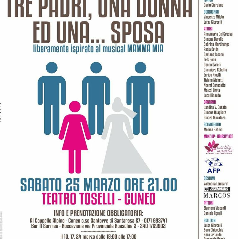 Il musical è messo in scena dalla compagnia amatoriale formata da un gruppo di genitori che, pur facendo altro (avvocati, medici, infermieri, liberi professionisti, educatori e ballerini), gratuitamente e con l’aiuto della regista, Ilva Fontana, hanno deciso di mettersi in gioco per raccogliere fondi da destinare in beneficenza (O.N.L.U.S., scuole ect.) convinti che se “uno sogna da solo, è solo un sogno; se tanti sognano insieme, è l’inizio di una nuova realtà“ (F.Hudertwass). Così i “PAZZI DI CUORE” tornano al Toselli con Tre padri, una donna ed una... sposa, liberamente ispirato al musical Mamma Mia.