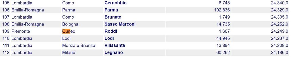 E' Roddi, in posizione 109 della speciale classifica curata dal sito che pubblica i dati sotto l'egida dell'Ancitel, a detenere il primato cuneese.