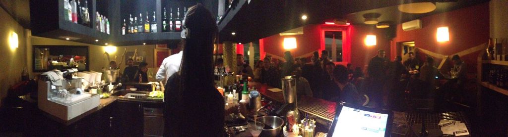 Un locale innovativo che si distingue in tutto: dai colori degli interni, nero-oro-rosso, all’arredo chic e funzionale. Ma è subito quell’atmosfera unica ed accogliente, a partire dal bancone centrale che domina il lounge bar, a coinvolgere l’ospite facendogli provare un immediato relax fra le belle poltrone o sui divani della sala. La percezione è quella di sentirsi a casa. E qui, seduti in compagnia a sorseggiare un ottimo cocktail, sono ben 85 le proposte in lista e tutte realizzate con grande professionalità, o dopo aver sceglieto un buon vino fra le innumerevoli etichette, fra una chiacchiera e l’altra sarà normale farsi portare una pizza, un tagliere, uno spaghetto allo scoglio… non c’è limite ai desideri. La buona musica che si diffonde nel locale ha anch’essa la sua magia, ad opera di Antonio che, esperto di materiali edili, ha inserito nel soffitto dei dischi fonoassorbenti risolvendo brillantemente il ritorno acustico e regalando quella musica diffusa che non infastidisce le conversazioni ma le accompagna.