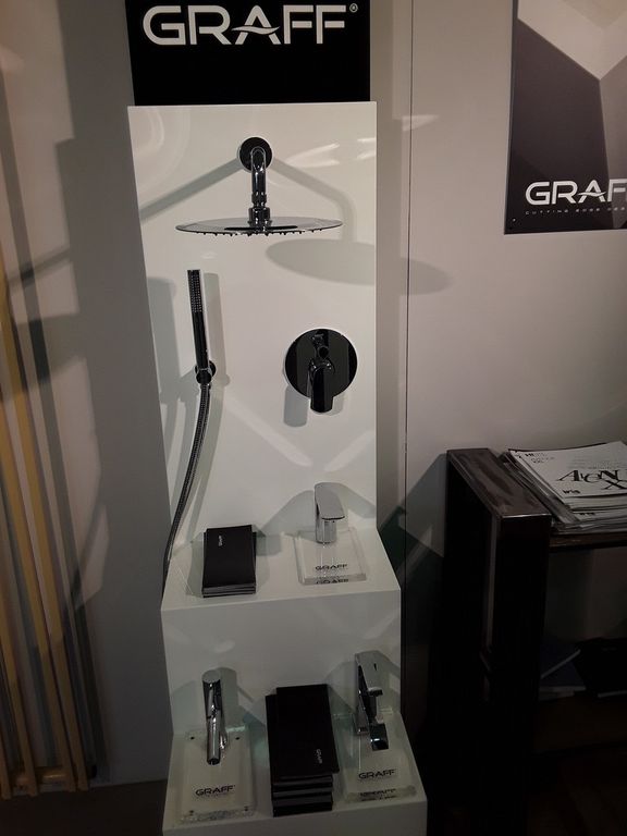 Presso lo stand anche sanitari con sistemi di scarico "rimless" ed elementi di rubinetteria della Graff (USA), con procedimento di cromatura innovativo. Presso lo Showroom in via Traversa di Barge 6 a Revello anche piastrelle per pavimenti e rivestimenti e materiali per l'edilizia.