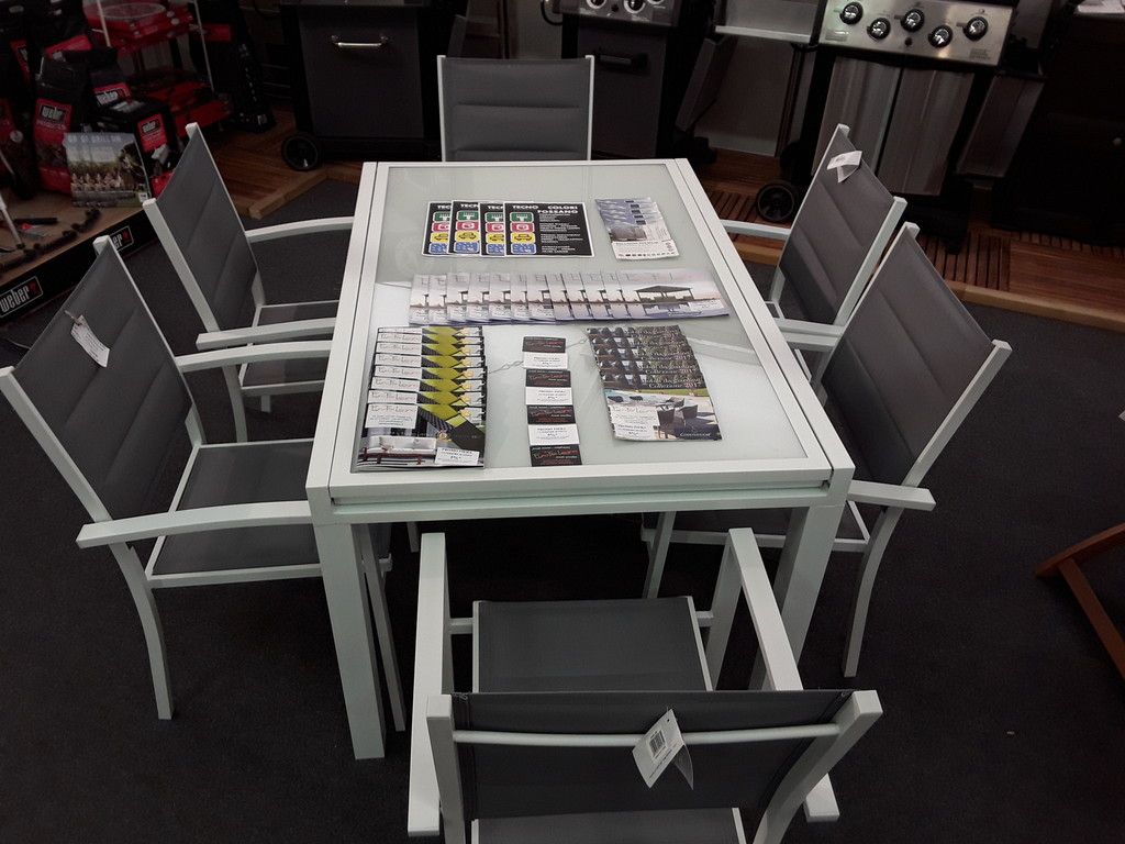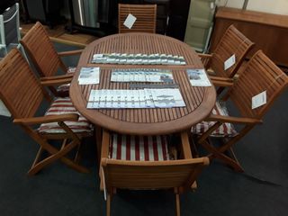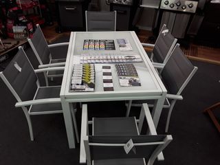 In esposizione il Set Oregon, composto da un tavolo allungabile con sei poltrone in legno balau (tipico orientale) e i rispettivi cuscini. Il Set Selinunte con tavolo sempre allungabile in alluminio e vetro e sedie in alluminio e textilene, e ancora, mobili da esterno in resina alimentare e poltrone/sedie sdraio in acciaio o alluminio con tessuto traspirante. Infine sei modelli di barbecue, tre a gas con bracere e coperchio in fusione di ghisa e tre a carbonella in acciaio smaltato.