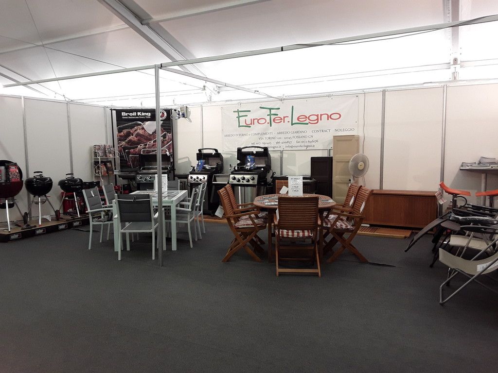 Articoli da giardino in legno, alluminio, sedie e poltrone in tessuto e barbecue dell'azienda Euro.Fer.Legno di Fossano alla GFE di Cuneo presso lo stand Tekno.