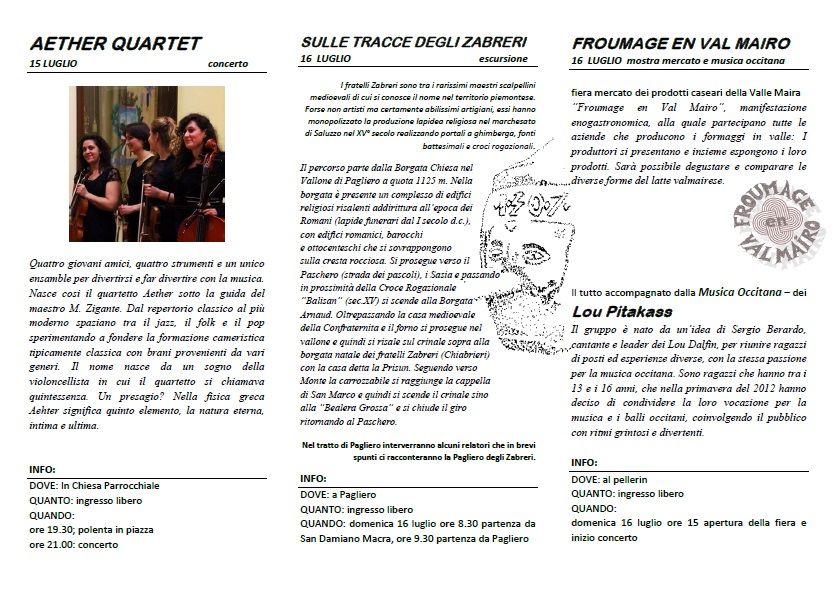 Nel pomeriggio inoltre la Pro Loco di Marmora fornirà assistenza culturale a tutti coloro che vorranno informazioni sulla Parrocchiale e sulle opere d’arte in essa contenute A Marmora la musica incontra l'arte. Architettura, bellezza del paesaggio e musica si uniscono per dare forma al concetto che in sé racchiude l'intero festival. Ad Aymavilles è nato, all'inizio degli Anni 80, il gruppo Trouveurs Valdotains che si occupa di ricercare sul territorio della Valle d'Aosta e nelle regioni limitrofe, appartenenti alla stessa cultura alpina, canti e danze tradizionali. Gli strumenti utilizzati appartengono anch'essi al campo della tradizione: fisarmonica, violino, flauto, clarinetto, cornamusa, ecc. Il repertorio proposto comprende canti in patois e in francese e arie di danza: monfarine, scottishe, giga, polka. Il gruppo Trouveur Valdotains è composto dai membri della famiglia Boniface di Aymavilles: Liliana Bertolo, Alessandro Boniface, Rémy Boniface, Vincent Boniface, ai quali si aggiungono, secondo le occasioni, differenti musicisti dell'area alpina.