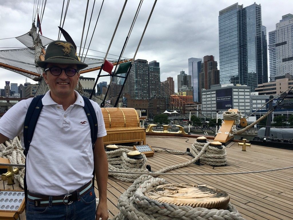 Claudio Testa della Biraghi Spa è in vacanza a New York e sapendo che l'Amerigo Vespucci avrebbe attraccato al "Pier 88" per qualche giorno ha portato con sè il cappello da ufficiale Alpino. Così ho tenuto alto l'onore del nostro amato corpo anche sulla più bella nave del mondo!!! "Memorabile fu l'incontro nel Mediterraneo con la portaerei statunitense USS Independence, nel 1962, che lampeggiò con il segnalatore luminoso: «Chi siete?», a cui fu risposto: «Nave scuola Amerigo Vespucci, Marina Militare Italiana». La nave statunitense ribatté: «Siete la più bella nave del mondo»."
