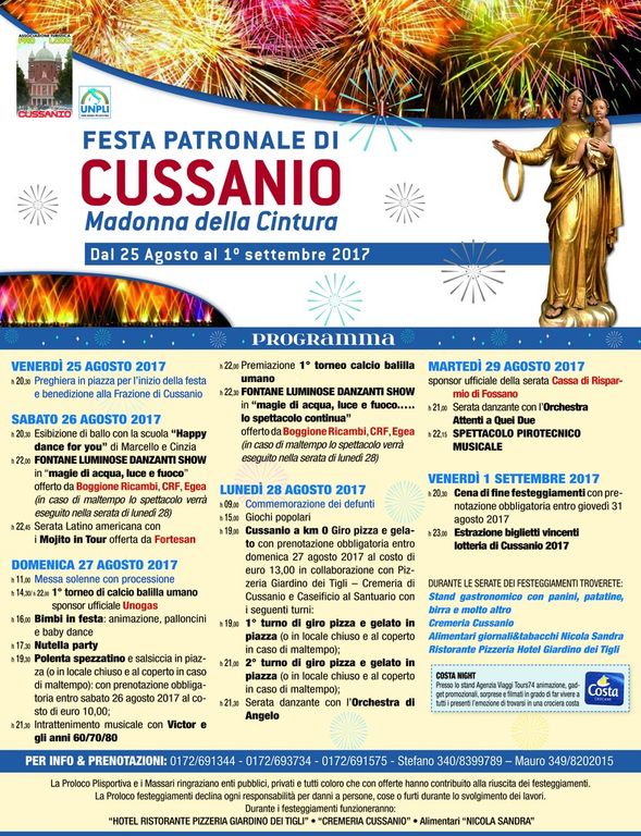 Lunedì 28 agosto alle ore 15,00 giochi popolari. Alle 19,00 appuntamento gastronomico "Cussanio a km 0": giropizza e gelato a 13,00 euro In collaborazione con la pizzeria Giardino dei Tigli, la Cremeria di Cussanio e il Caseificio al Santuario (prenotazione obbligatoria). Alle ore 21.30 serata danzante con l’Orchestra di Angelo.