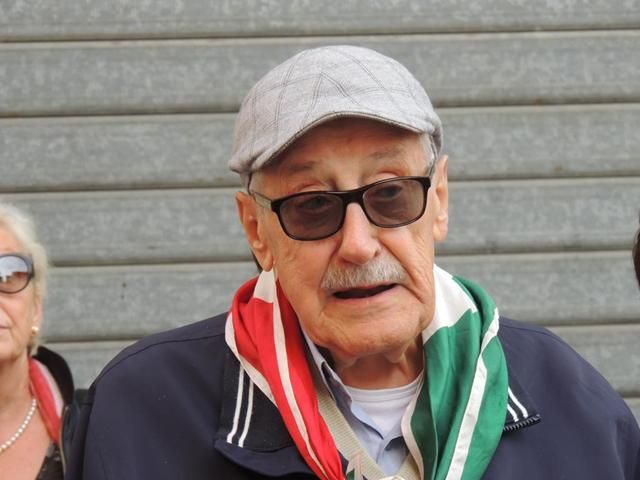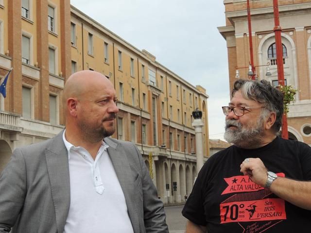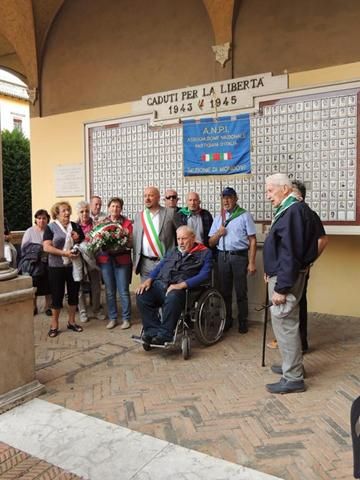 Domenica mattina, Vico e Sergio Giammarchi, novantunenne Partigiano del Battaglione Corbari, ci hanno guidato lungo i luoghi più significativi della Resistenza forlivese. Seguendo le precise ed esaurienti spiegazioni di Sergio, siamo giunti in piazza Aurelio Saffi dove ci attendeva il Sindaco, Davide Drei, che ha dato ufficialità alla posa dell’omaggio floreale ai piedi della lapide, posizionata in ciò che resta del chiostro della Chiesa di San Mercuriale, che ricorda i caduti forlivesi della Lotta di Liberazione.