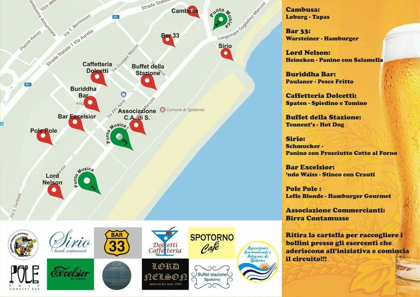 Spiega Massimiliano Semenza, presidente dell’Associazione Commercianti di Spotorno: “Abbiamo realizzato una brochure da distribuire alla clientela con una cartina che segnala i vari punti musicali e i bar che hanno aderito. In questo pieghevole è presente anche una raccolta bollini: chi consuma una birra può applicare un bollino, dopodiché, quando si arriva a cinque o a nove bollini ci si può recare allo stand dell’Associazione Commercianti e Artigiani di Spotorno in piazza e si riceve in omaggio una birra piccola (con 5 punti) o grande (con 9 punti)”.