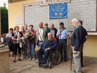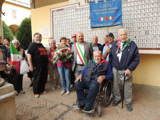 Domenica mattina, Vico e Sergio Giammarchi, novantunenne Partigiano del Battaglione Corbari, ci hanno guidato lungo i luoghi più significativi della Resistenza forlivese. Seguendo le precise ed esaurienti spiegazioni di Sergio, siamo giunti in piazza Aurelio Saffi dove ci attendeva il Sindaco, Davide Drei, che ha dato ufficialità alla posa dell’omaggio floreale ai piedi della lapide, posizionata in ciò che resta del chiostro della Chiesa di San Mercuriale, che ricorda i caduti forlivesi della Lotta di Liberazione.
