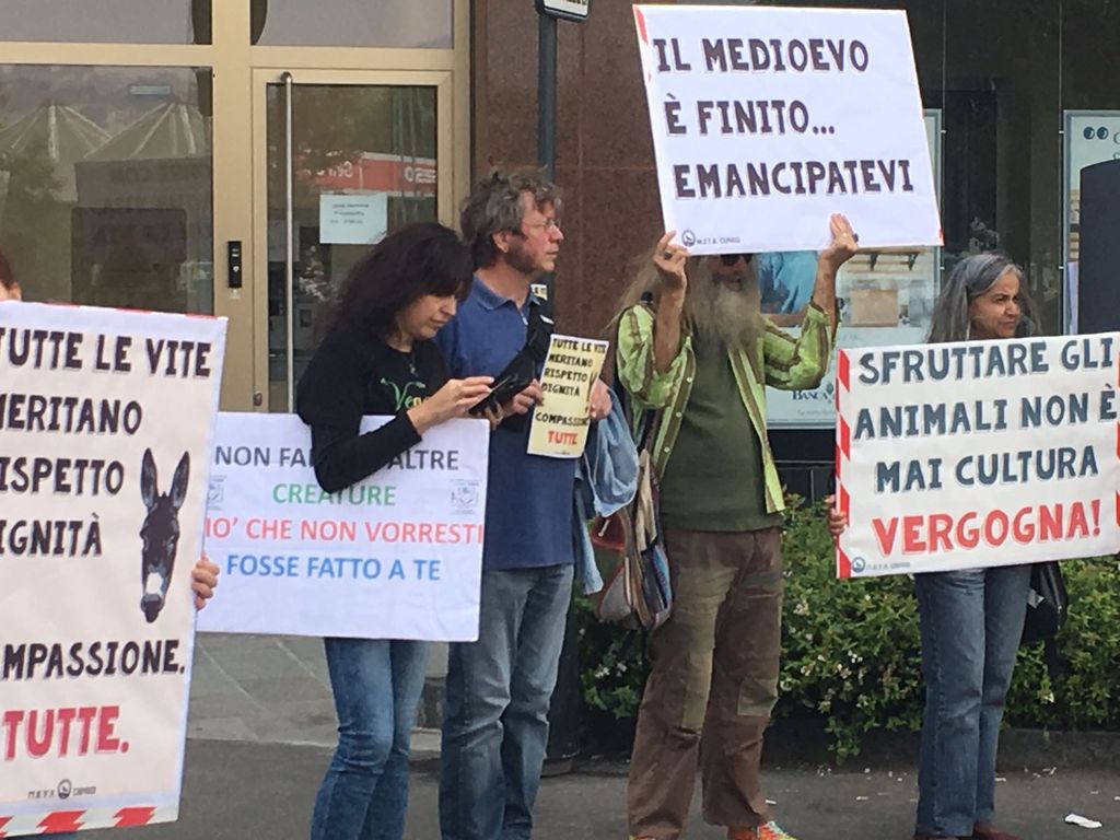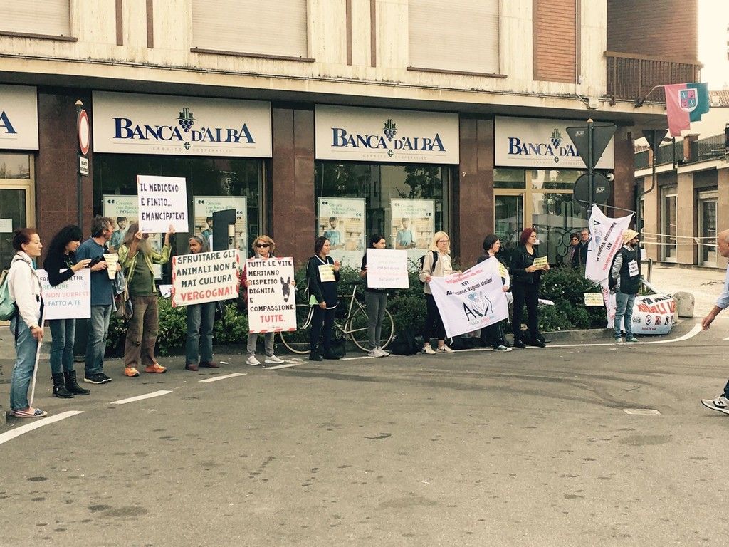 "La corsa degli asini e le rappresentazioni che coinvolgono anche animali, tra cui cavalli, asini e bovini, vanno fermate", si sente gridare all'ingresso di Alba. "Il Medioevo è finito. Emancipatevi!" si legge sui cartelli indossati dagli animalisti.