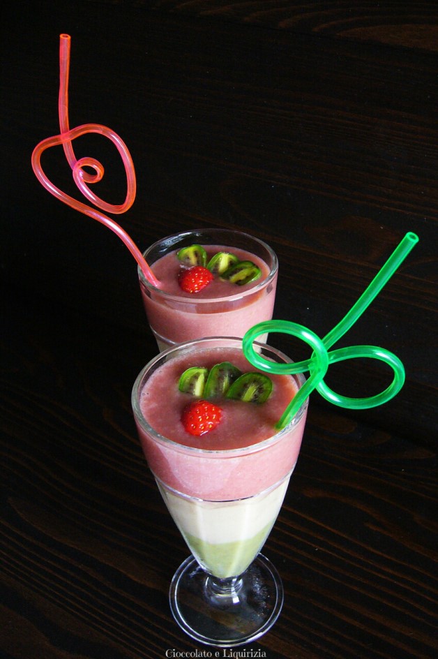 Per ottenere gli strati coloratati, dovrete prima frullare le banane con il latte e il limone fino a quando non sarà tutto omogeneo. Il limone è indispensabile per non far ossidare i frutti. Poi travasate il frullato appena ottenuto in un contenitore e tenetene circa un terzo nel frullatore e a questo aggiungete i Nergi e frullate. Versate il frullato verde nei vostri bicchieri, prestando attenzione a non colarlo sui bordi. Per essere sicuri che quando verserete la parte bianca non si mischi, mettete i bicchieri nel freezer per circa 15/20 minuti. Ora sciacquate il frullatore, per eliminare il verde, e ponete all’interno metà del frullato alla banana che avete tenuto da parte. Aggiungete le fragole e frullate. Quando la parte con Nergi nei bicchieri è abbastanza solida potete versare la parte con solo banana e porre nuovamente in freezer. Ci vorrà meno tempo poiché il bicchiere è già gelato. Trascorsi circa 10 minuti (controllate con un dito che sia abbastanza solido), versate anche il restante frullato con le fragole.