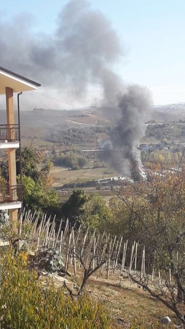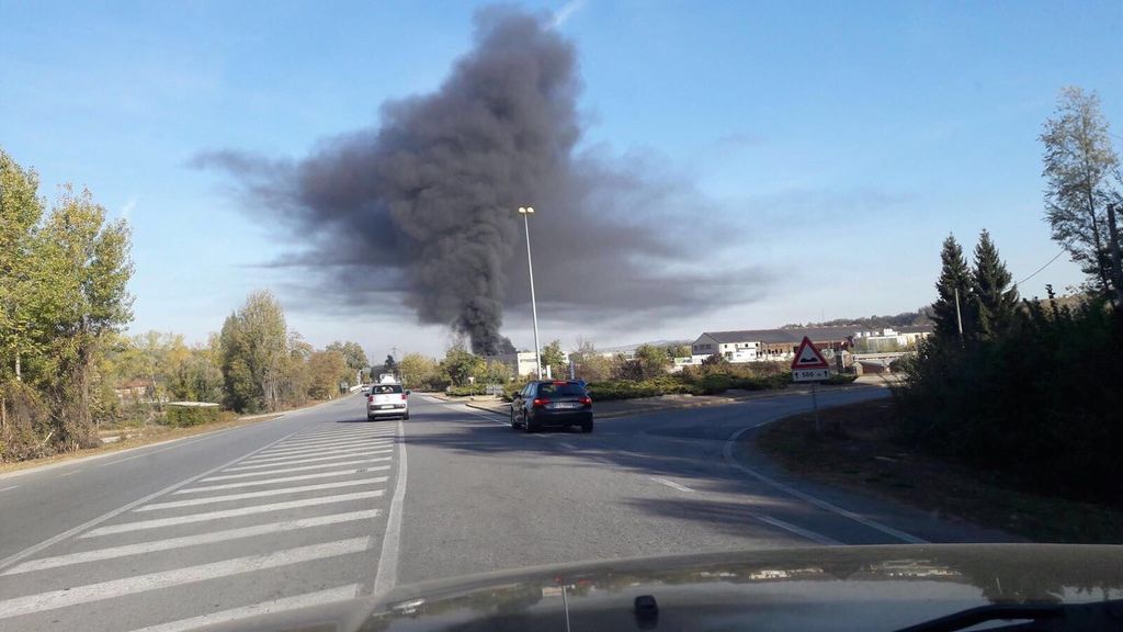 A fuoco un capannone a Farigliano: colonna di fumo nero visibile da grande distanza
