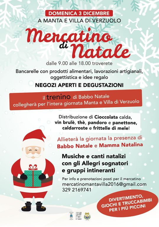 Dalle 9 alle 18 di domenica 3 dicembre il trenino di Babbo Natale collegherà per l’intera giornata Manta con Villa di Verzuolo, dove troveremo, oltre ai negozi aperti, il tradizionale Mercatino di Natale con bancarelle di prodotti alimentari, lavorazioni artigianali, oggettistica e idee regalo.
