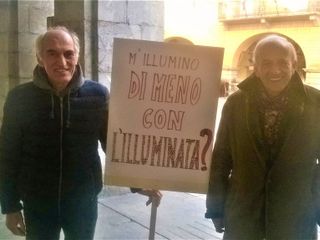 Fuori dal palazzo del comune, il consigliere comunale Ugo Sturlese con un inequivocabile cartello: "M'Illumino Di Meno... con l'Illuminata?"