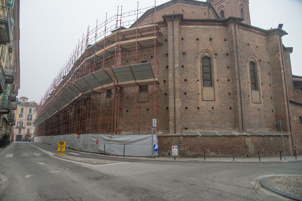Il Duomo di Saluzzo è “ingabbiato” dalle imponenti impalcature che consentiranno i lavori di restauro, partiti proprio in questi giorni.