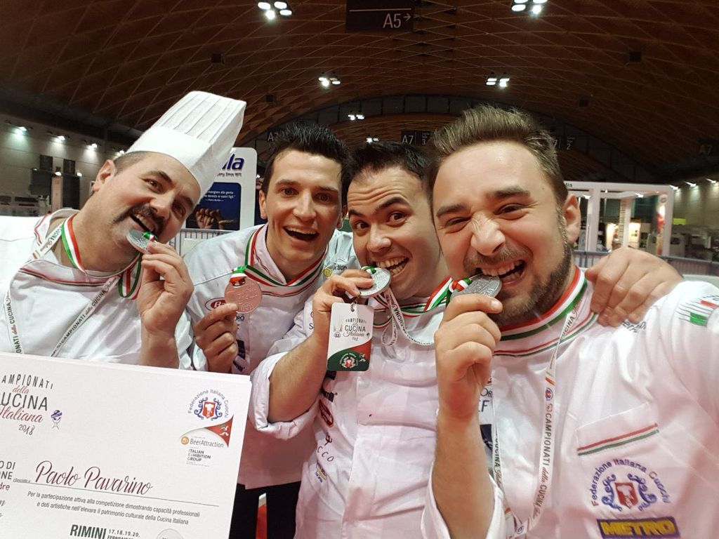 Il menù vincente era composto da: trota in diverse forme e consistenze, l’agnello sambucano spalla e carrè cucinato con la birra ed infine il dessert: il dolce amaro e lampone.Nell’ambito dei Campionati italiani di cucina di Rimini, si sono svolte altre importanti competizioni e anche qui il Team Cuochi Piemonte Cuneo, ha saputo distinguersi, aggiudicandosi riconoscimenti con diplomi e medaglie. Complimenti quindi ad Andrea Audisio per la gara Sculture Artistico Live, Valter Nerozzi per Sculture Artistiche di Pasticceria, Marco Vecchi nell'Artistico Vegetale ed infine nella gara di Singolo Caldo di Cucina Mediterranea con Adil El Adham.