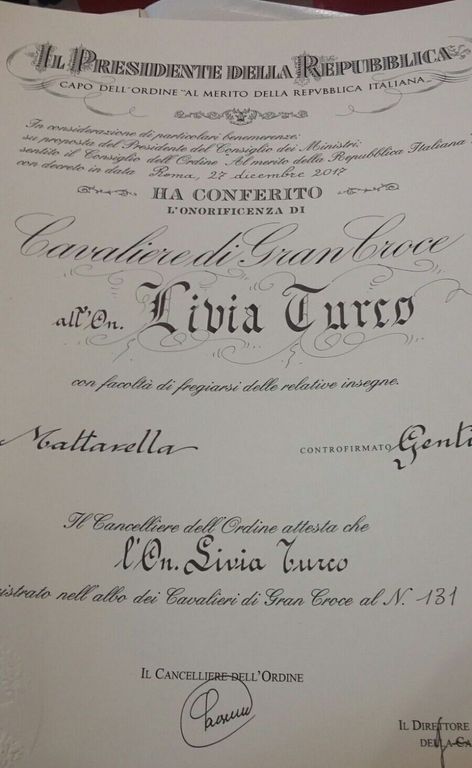 Livia Turco Cavaliere di Gran Croce della Repubblica italiana.