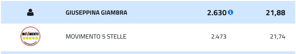 Tête-à-tête sul secondo e terzo posto al Senato tra centrosinitra e Movimento 5 Stelle. Al momento al secondo posto la candidata per il centrosinistra in corsa per il Pd Marta Giovannini (22,35%, 172 voti al singolo candidato) seguita dalla candidata pentastellata Giuseppina Giambra (21,88%, 157 al solo candidato).