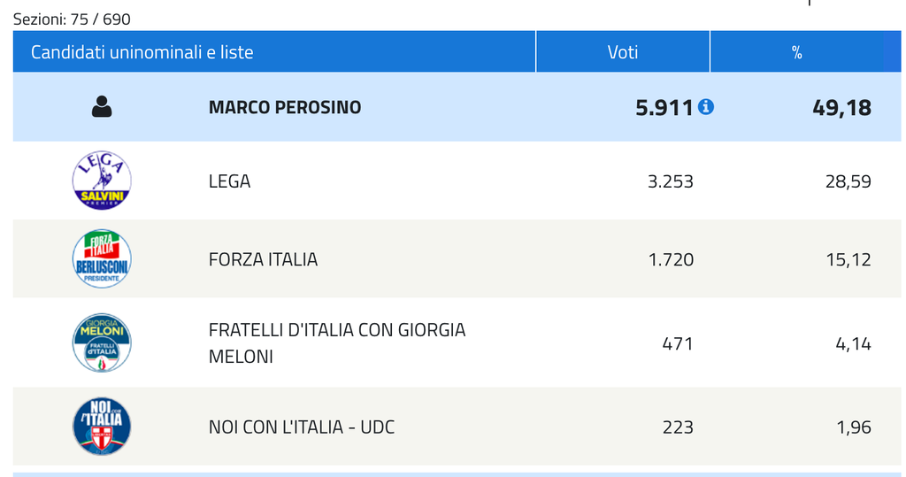 Scrutinati al momento 75 seggi su 690 al Senato dove è presente un unico collegio su tutta la Granda. Avanti con il 49,18% il sindaco di Priocca e candidato uninominale al Senato per la coalizione di centrodestra Marco Perosino (244 i votanti che hanno crocettato singolarmente sul candidato in corsa per il Senato).