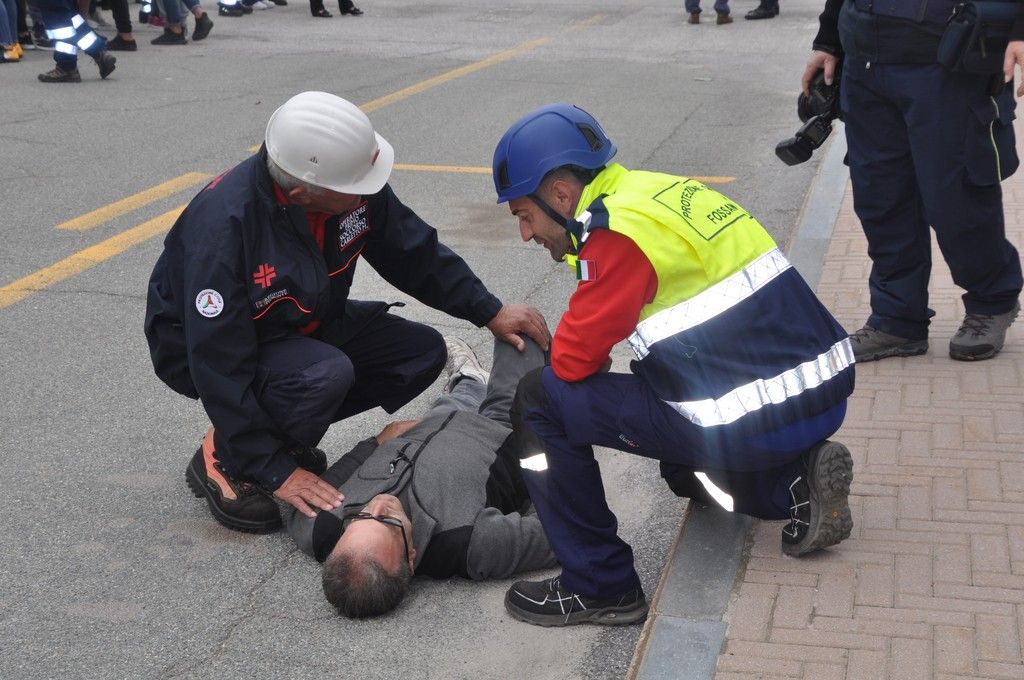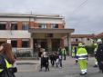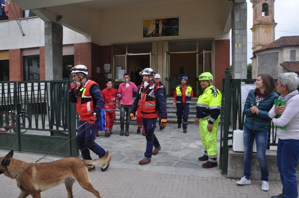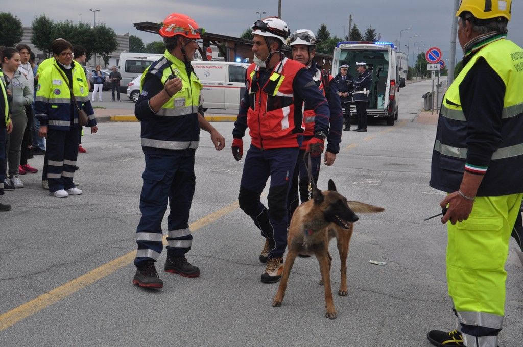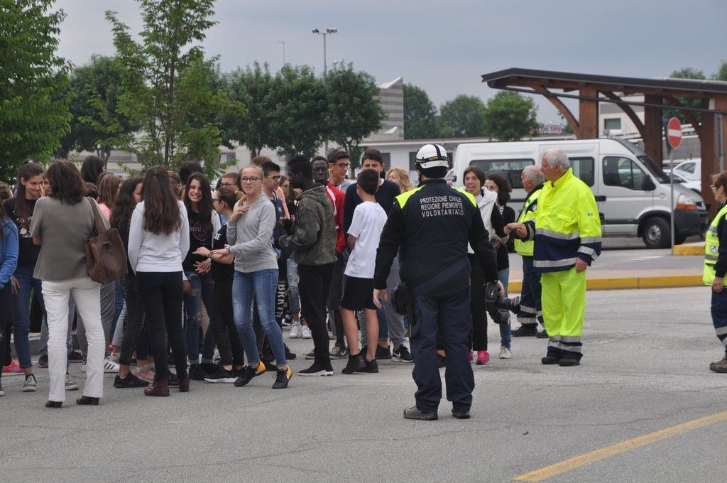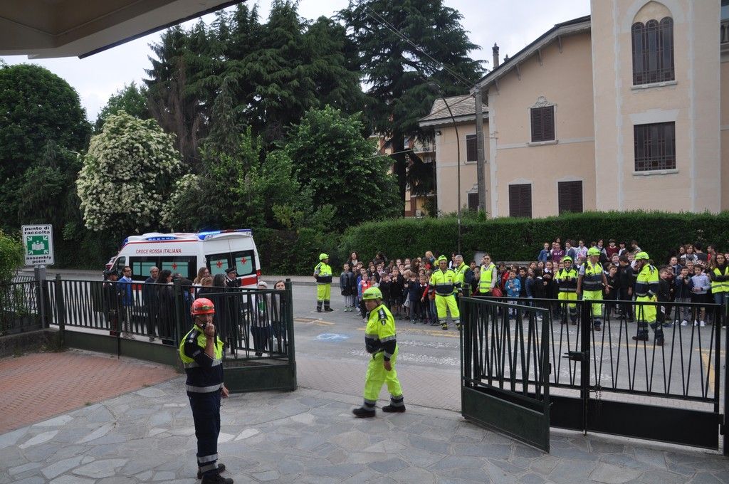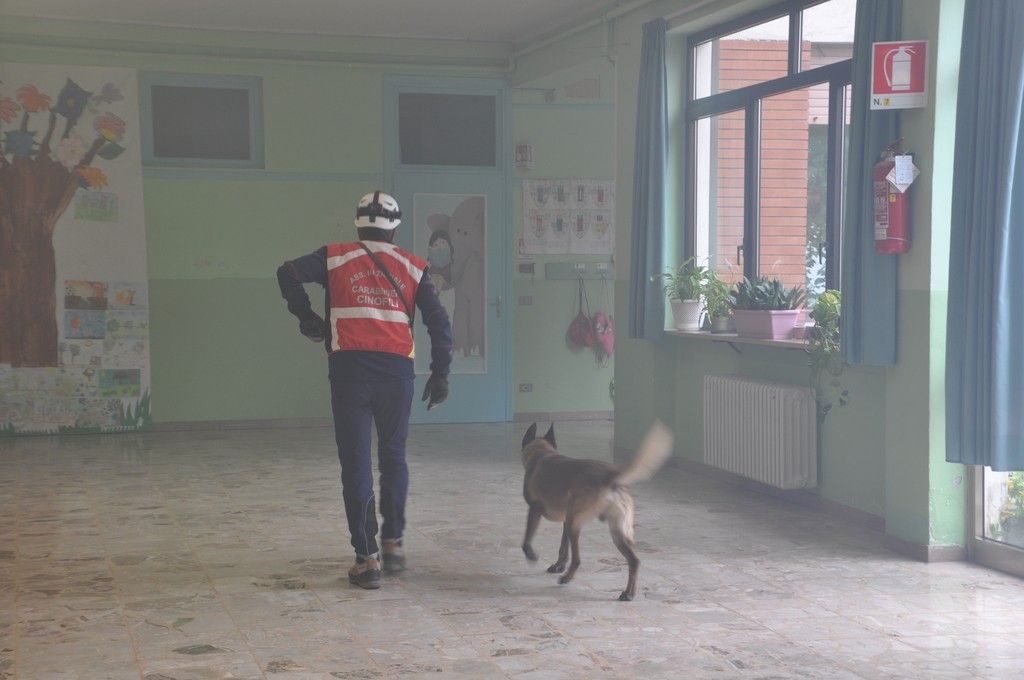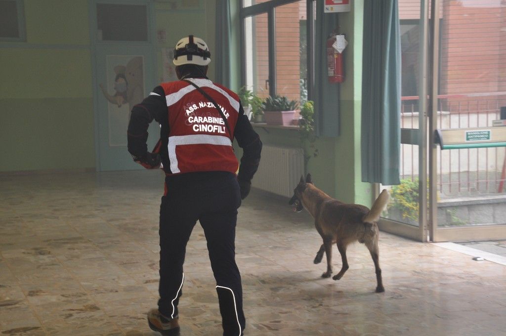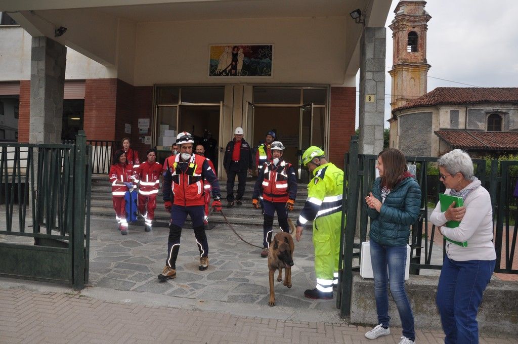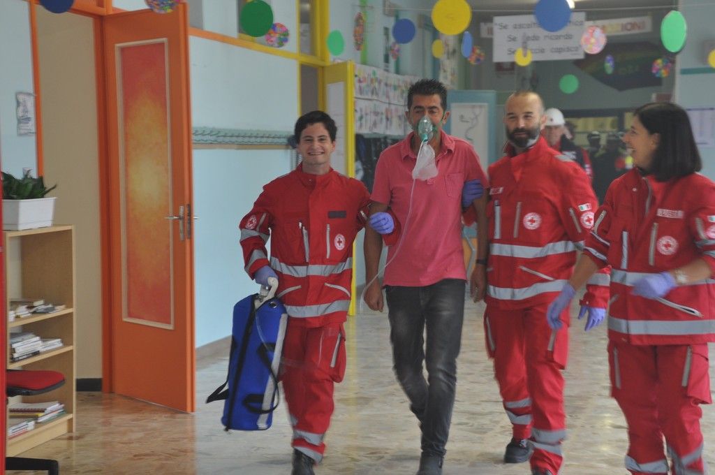 Tutti fuori gli studenti, alcuni con un panno sul volto, verso il punto di raccolta, dove hanno assistito alla stabilizzazione di un ferito e al recupero di un disperso con l'ausilio dei cinofili.