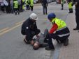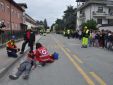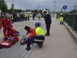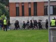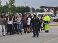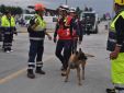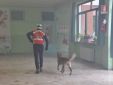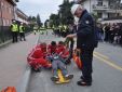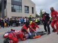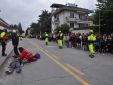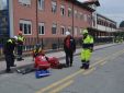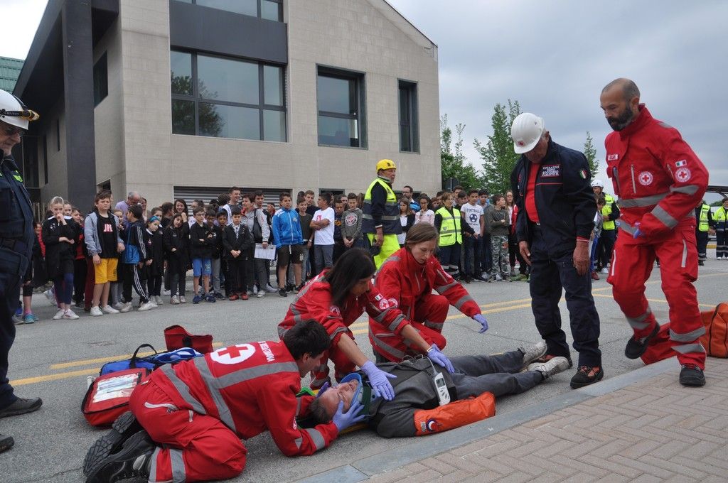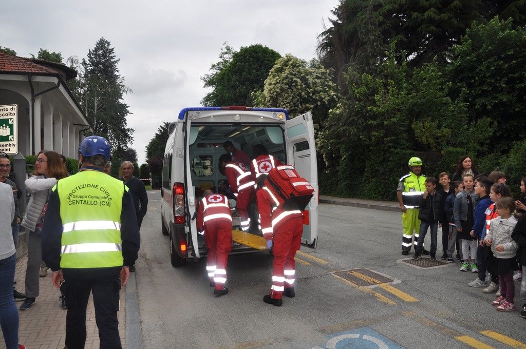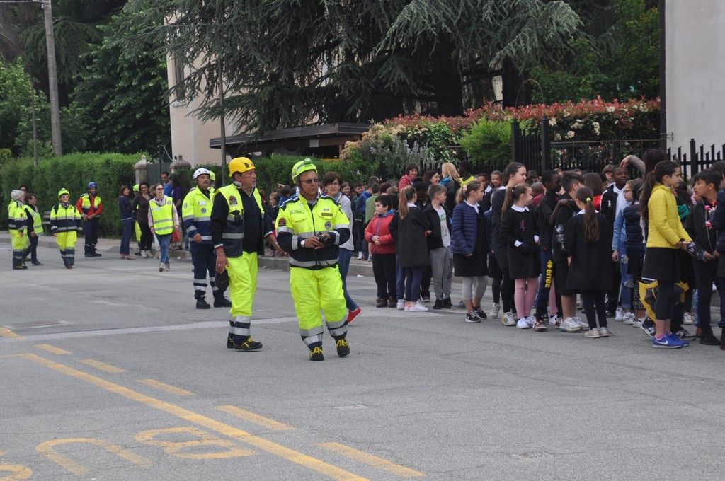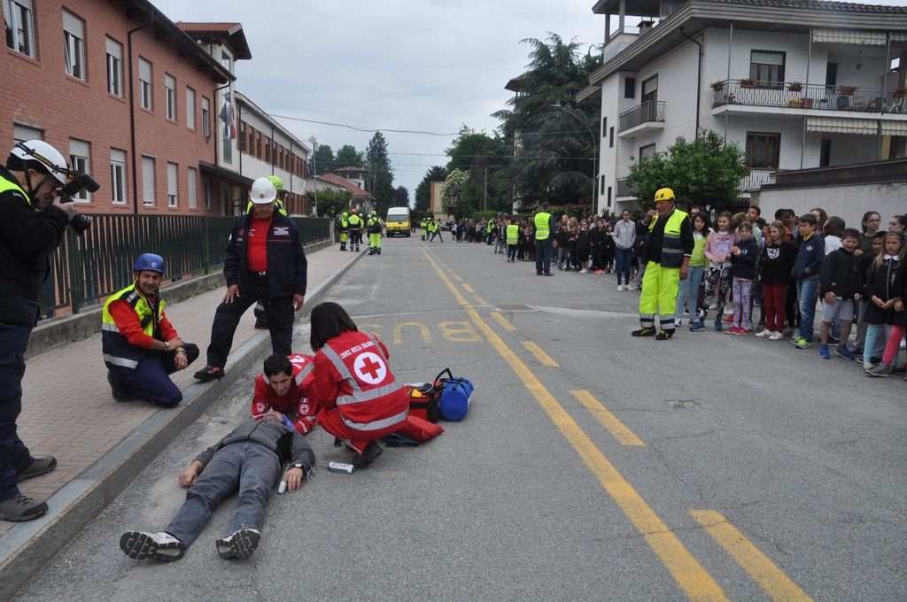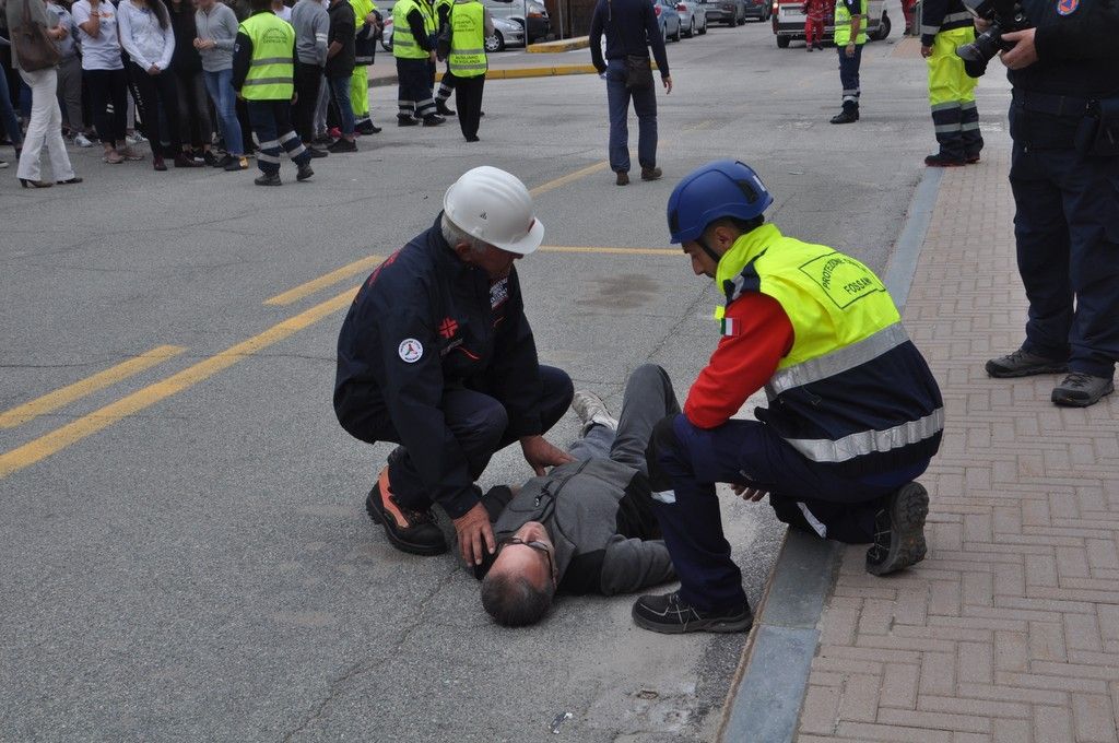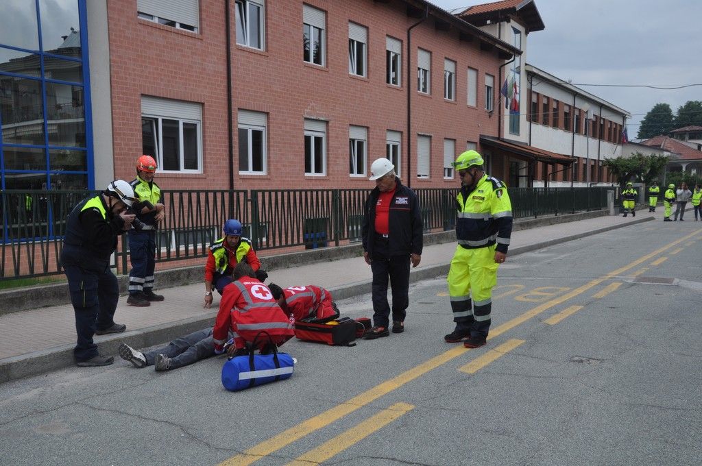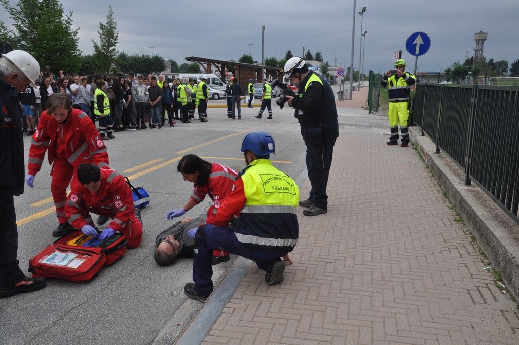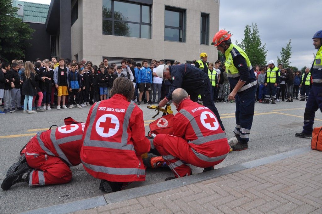 Tutti fuori gli studenti, alcuni con un panno sul volto, verso il punto di raccolta, dove hanno assistito alla stabilizzazione di un ferito e al recupero di un disperso con l'ausilio dei cinofili.