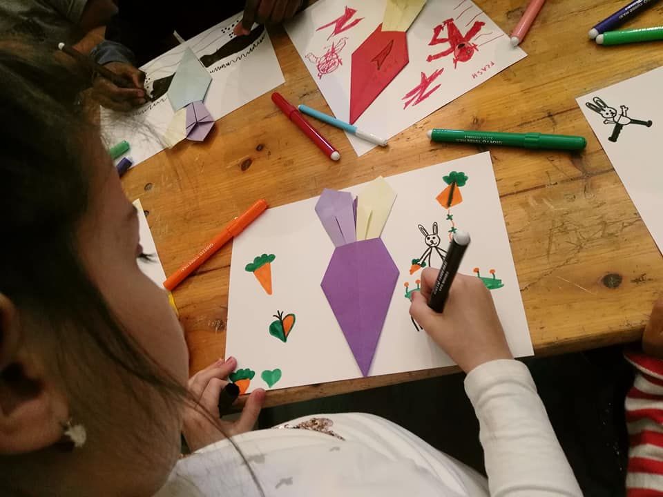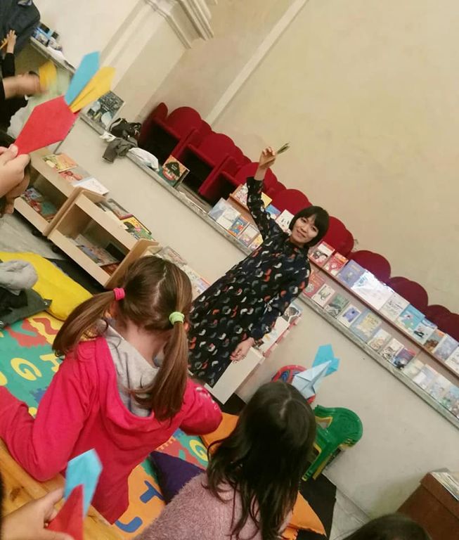 Accolti dalla dolce Satoe in persona e dall’illustratore monregalese Marco Somà (un’altra gloria locale ben nota ai bambini grazie alle letture con l’insegnante Cristina Zocco, ideatrice di Little bibliolibrì itinerante), organizzatore di Illustrada 2018, hanno percorso con gli sguardi incantati le illustrazioni originali in acrilico de La carota gigante, e poi le matite colorate di Quello è il mio posto, l’albo appena uscito nelle librerie. L’arte giapponese dell’origami è poi stata spunto di realizzazioni artistiche e creative in cui ogni alunno, preso dall’entusiasmo, ha dato il meglio di sé.