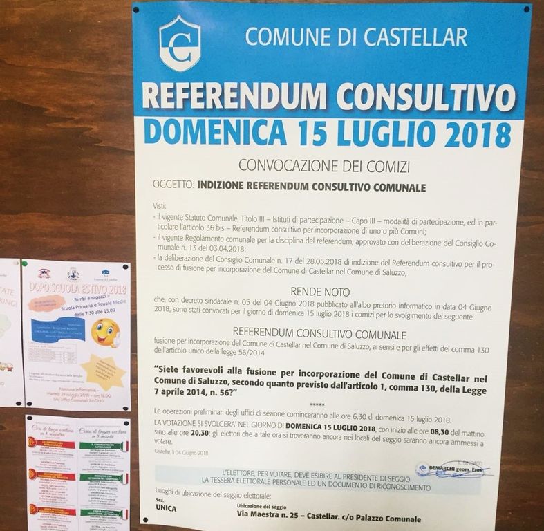Nonostante la notizia avesse già di per sé tutti i crismi dell’ufficialità, i sindaci di Castellar e Saluzzo hanno indetto il referendum consultivo sulla fusione per incorporazione tra i due Comuni.