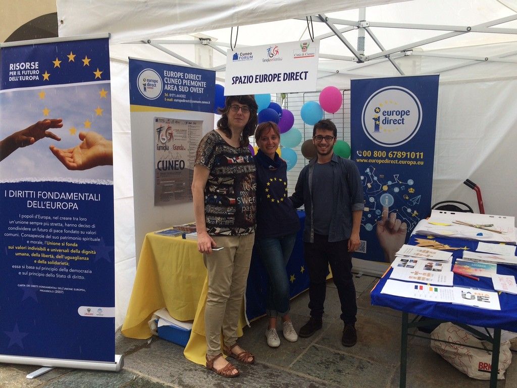 Dallo scorso 1° marzo il Comune di Cuneo ha un nuovo sportello che guarda all'Europa. Si chiama, infatti, Europe Direct, presente con uno stand nella giornata dedicata alle famiglie della Granda, ieri in un'animatissima via Roma.