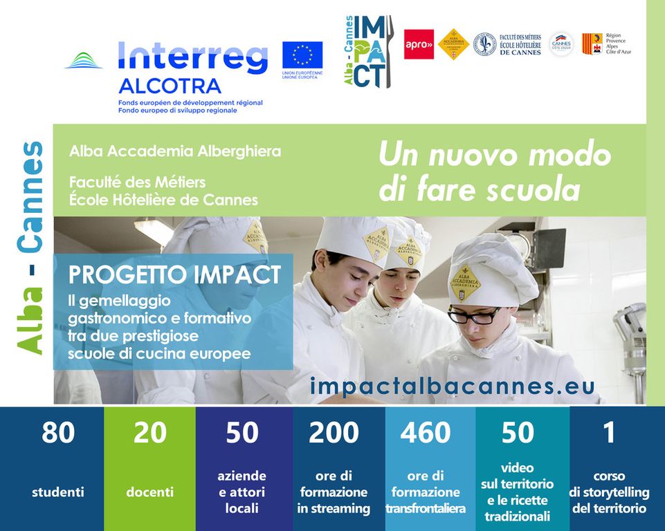 Ecco i numeri di IMPACT: 80 allievi, 20 docenti, 50 aziende e attori locali coinvolti, 200 ore di lezioni in streaming, 60 ore di storytelling del territorio, 50 video sui territori di Alba e Cannes, 160 ore di tirocini all’estero, il 70% di studenti occupati a fine percorso.