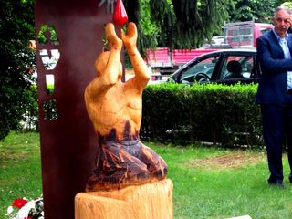 “Per la realizzazione abbiamo pensato ai materiali che identificano il nostro territorio: il legno per la statua, la pietra per il basamento e l’acciaio per la lamina che lo sovrasta. L’immagine rappresenta l’uomo sofferente implorante aiuto, (opera realizzata su nostra indicazione da Ciarma Fabrizio conosciuto come Barba Frisiu); su di lui incombe il manto dell’indifferenza rappresentata dalla fredda lamina d’acciaio che sembra opprimerlo. Accorre però in suo aiuto, superando l’indifferenza, la mano della solidarietà, in questo caso il donatore di sangue, che sfonda d’impeto il muro dell’indifferenza che purtroppo oggi sembra prevalere, ridonando così speranza all’umanità” spiega il Presidente della sezione Leo Acchiardi.