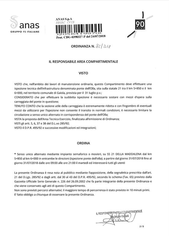 Martedì 24 luglio ANAS emette ordinanza di senso unico alternato regolato da semaforo sul ponte dell'Olla lungo la SS 21 nel territorio del comune di Gaiola a scopo di "ispezione tecnica dell'infrastruttura" per il 31 luglio dalle ore 9 alle ore 21.