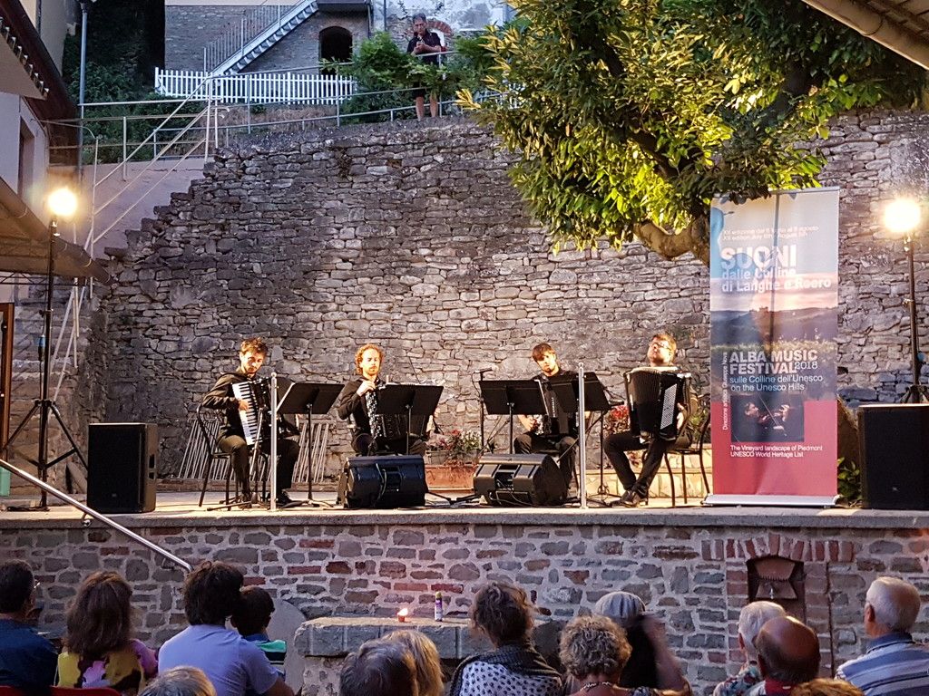 Si sono svolte con un enorme successo di pubblico le due serate della rassegna Alba Music Festival nel territorio di Cossano Belbo. La prima nell’accogliente Mulino Marino, accanto al famoso Mulino a pietra che sforna quotidianamente la delicata farina naturale, nell’angolo in cui il patriarca della famiglia nonché nobile partigiano Felice Marino, trascorreva la sua meritata pensione, il Quartetto Aires, 4 giovani fisarmonicisti internazionali, hanno saputo far divertire il numeroso pubblico accorso per l’occasione con la loro rappresentazione denominata Acquarelli. Eseguendo brani per fisarmonica da loro riadattati, ma anche pezzi di loro creazione oltre a famosi brani del maestro argentino Astor Piazzolla, in oltre un’ora di accattivante musica e di ritmi trascinanti, i 4 musicisti hanno saputo rendere magica la serata. Una prelibata torta di nocciola ed un rinfrescante Moscato d’Asti, un riuscitissimo accostamento offerto dai Ragazzi della Locale Pro Loco, ha concluso degnamente l’incontro musicale.