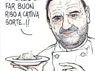L’idea di Danilo Paparelli - giornalista, vignettista e autore satirico, attivo a Cuneo da oltre trent’anni nel campo del disegno umoristico – di ritrarre 73 chef stellati è nata per un volume dal titolo omonimo “Più fumetto che arrosto” edito da Nerosubianco e recentemente premiato al Casinò di Sanremo con la targa “Libro più gustoso dell’anno 2018”.