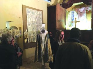 Quindi, esposti nella sacrestia, il seicentesco stendardo processionale e i settecenteschi paramenti sacri, restaurati da Elena Ghio e Tiziana Assogna, con la consulenza di Gianluca Bovensi, e riportati all'antico splendore grazie al fundraising presso la comunità e a donatori privati, oltre che in virtù del contributo delle fondazioni bancarie CRT e Compagnia di San Paolo. Nello stesso spazio, anche l'opera di arte partecipata realizzata con l’artista/performer Veronique Pozzi Painè. Attiva tra Milano e Berlino con mostre personali e collettive, l’artista è impegnata in molteplici progetti di Arte Partecipata, perseguendo l’obiettivo di “fare arte” coinvolgendo attivamente le persone nel processo creativo. È quanto si è svolto a Guarene dove anziani, ospiti della casa di riposo, popolazione, bambini dell'Estate ragazzi e delle Scuole Elementari, guidati dall'artista, si sono espressi nel reinterpretare la tradizione del ricamo per dare vita a un grande opera in stoffa, decorata con gli attributi iconografici di Santa Elisabetta, cara alla Compagnia delle Umiliate. L'installazione, non ancora conclusa, è una vera e propria “opera aperta” che, nel tempo, si arricchirà di nuovi elementi.