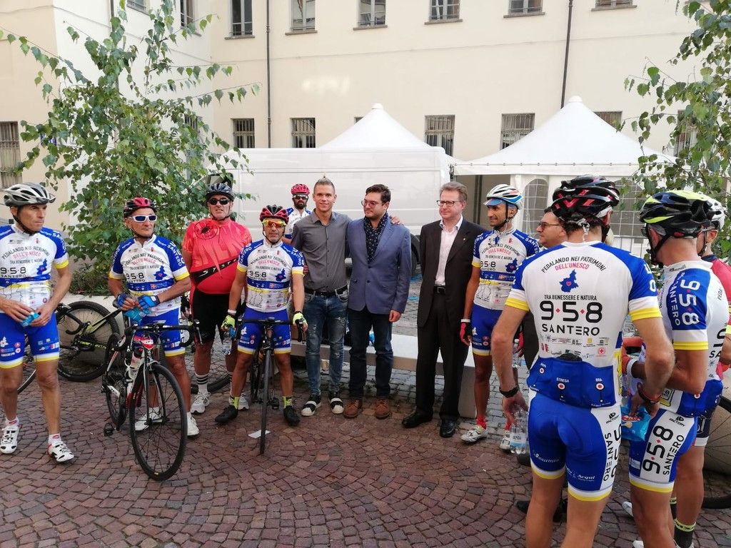 Ha fatto tappa ad Alba nel pomeriggio di oggi, venerdì, ed si è poi diretta a Bra la carovana di “Pedalando nei Patrimoni Unesco del Piemonte”, manifestazione non competitiva che sino a domenica attraverserà su due ruote alcuni tra i più suggestivi siti riconosciuti patrimonio artistico e ambientale dell’Umanità, tra cui i paesaggi vitivinicoli di Langhe, Roero e Monferrato, il sacro monte di Crea, il santuario di Oropa, le cattedrali sotterranee di Canelli e il villaggio palafitticolo di Viverone.