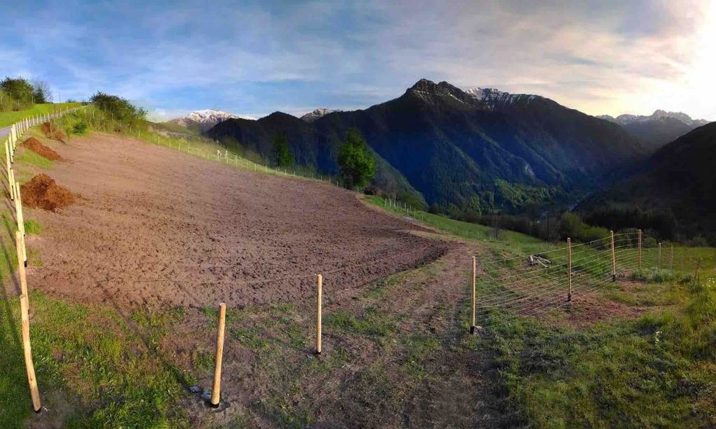 La coltivazione dei campi sfruttabili, perché non troppo scoscesi o occupati dal bosco, si aggiunge con il passare del tempo. All’inizio Daniele sfrutta il migliaio di metri di proprietà della famiglia, “sfornando” le classiche verdure dell’orto. Poi acquista dei terreni specializzandosi nella produzione delle patate. Adesso ne pianta 45 varietà, tra le quali alcune molto rare. Un nuovo appezzamento riservato al tubero lo sta bonificando per il prossimo anno con il taglio di arbusti e frassini. Altre superfici sono destinate a pere, mele, piccoli frutti, erbe officinali. E a prato per alimentare una capra e le pecore allevate. Una parte di queste ultime molto particolari: infatti, sono della razza Muso Nero del Vallese in via di estinzione. I terreni coltivati hanno le reti protettive per evitare i danni della fauna selvatica. In totale la superficie utilizzata, più o meno ripida, è di due ettari.