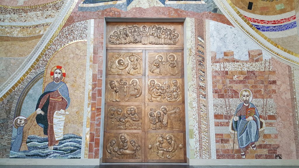 La stessa che si respira davanti alle immagini raffigurate sul portale dedicato alla vita della Madonna. In tutto sei caselle in cui hanno trovato alloggio episodi evangelici in cui la Vergine è sempre presente e ci parla del Figlio, facendosi veicolo di salvezza: la discesa dello Spirito Santo; l’annunciazione; la visitazione alla cugina Elisabetta; la nascita di Gesù; l’adorazione dei Re Magi; le nozze di Cana; il dolore ai piedi della Croce; l’assunzione in cielo; l’incoronazione come Regina del Cielo e della Terra.