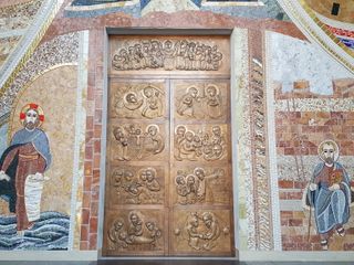 Il pregevole portale si unisce al significativo mosaico che, con la sua vasta estensione, occupa interamente l’area del Santuario denominata pronao, rendendola solenne e, al tempo stesso, catechetica, facendo in modo che i fedeli siano aiutati con gli occhi a leggere l’annuncio salvifico di Cristo. L’opera, definitivamente completa, rende il Santuario della Madonna dei Fiori un’oasi di bellezza per gli amanti dell’arte e un’oasi di pace spirituale per chi cerca nella fede quello che la sola concretezza materiale del mondo non può dare.