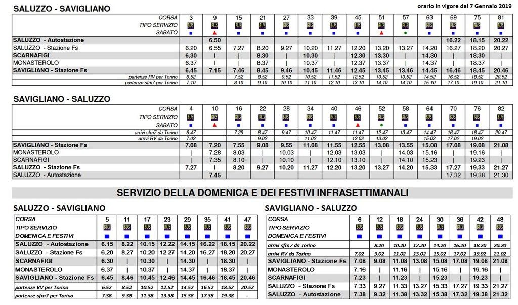 La maggior parte delle corse in autobus (sia nei feriali che nei festivi) transiterà da Scarnafigi e Monasterolo di Savigliano, andando così ad implementare il servizio in “realtà importanti – aveva detto il sindaco di Saluzzo Calderoni – servite in modo non signorile e parziale”.