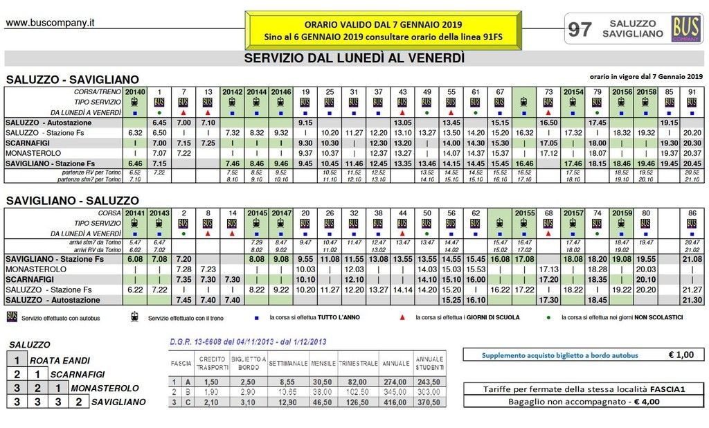 Recandosi presso gli uffici del centro servizi BusCompany di Saluzzo, in via Circonvallazione 19, si potrà ottenere un abbonamento mensile “Granda bus” valido per il mese di gennaio sulla tratta Saluzzo-Savigliano e utilizzabile anche per i treni della stessa tratta.
