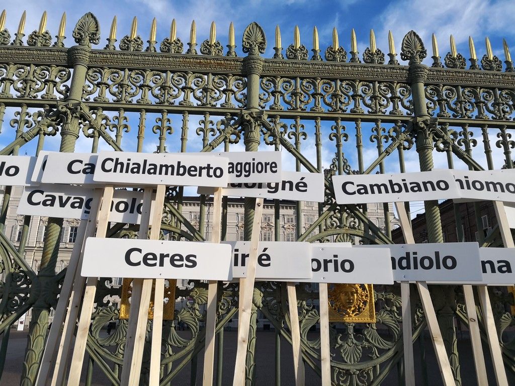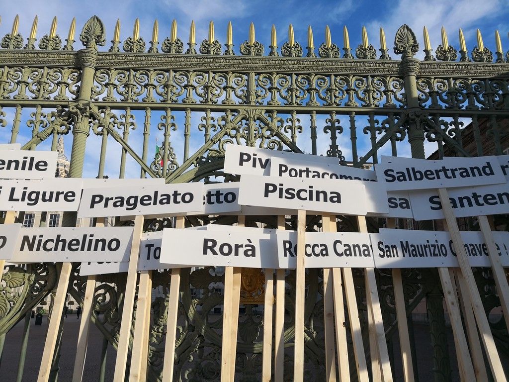 In piazza Castello sono circa un centinaio i cartelli - con su scritto il nome di altrettante città sparse per tutta Italia che hanno aderito al flash mob Sì Tav previsto questa mattina a Torino, promosso dal Comitato "Sì, Torino va avanti" e dal sottosegretario ai Trasporti Mino Giachino.