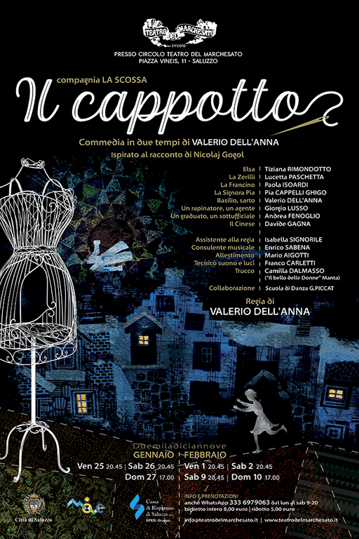 Debutta venerdì 25 gennaio alle 20.45 al Teatro del Marchesato (piazza Vineis 11) "Il Cappotto", commedia in due tempi di Valerio Dell’Anna, ispirata all’omonimo racconto di Nicolaj Gogol. Dello spettacolo, che vede in scena attori della Compagnia “La Scossa”, sono in programma sette repliche fino al 10 febbraio.