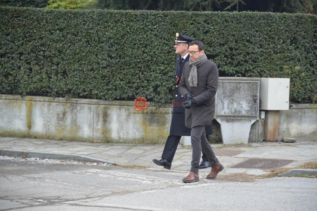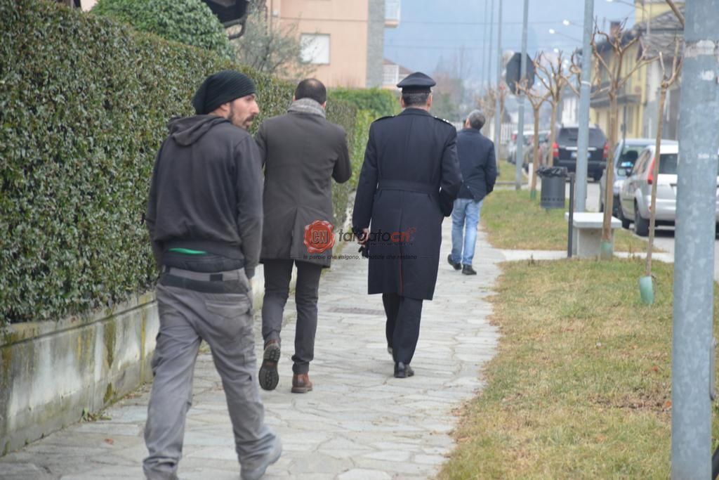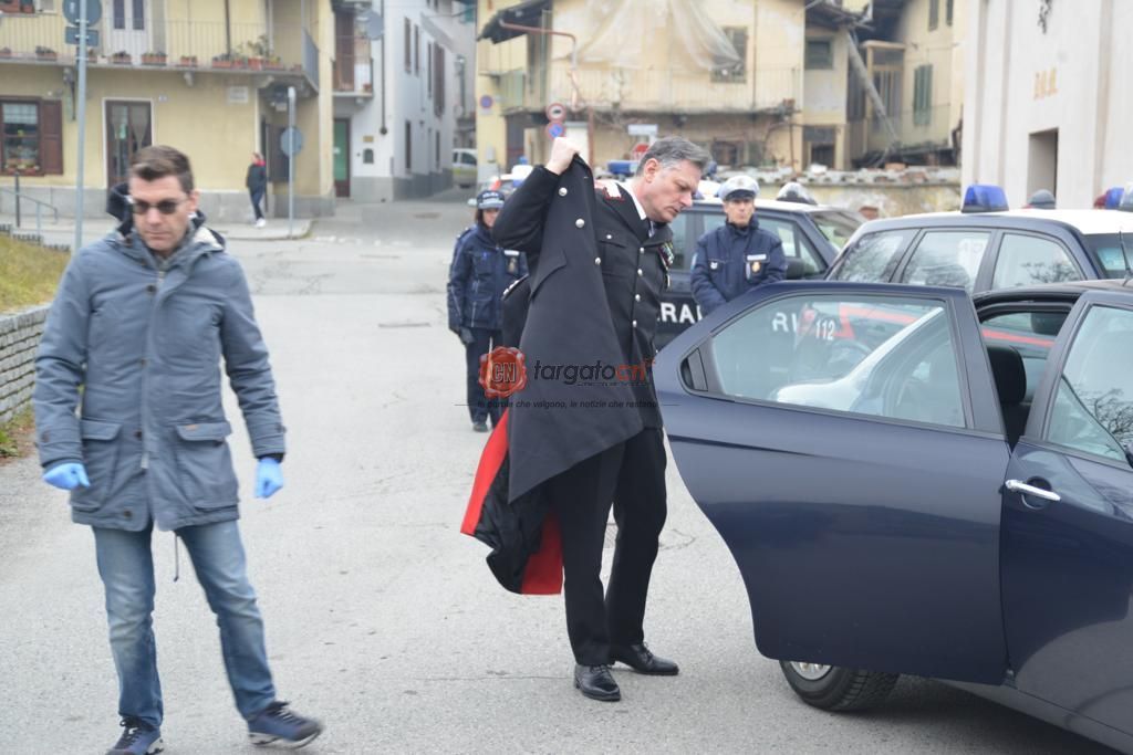 I Carabinieri conducono un uomo in caserma dopo il ritrovamento del cadavere di una donna a Barge