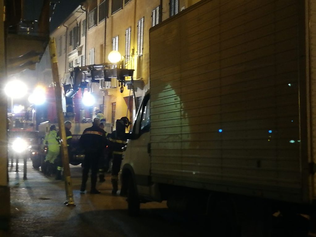 Traffico bloccato in via Oddino Barotti, a Fossano, dove un furgone è rimasto incastrato sotto un balcone, in pieno centro storico.