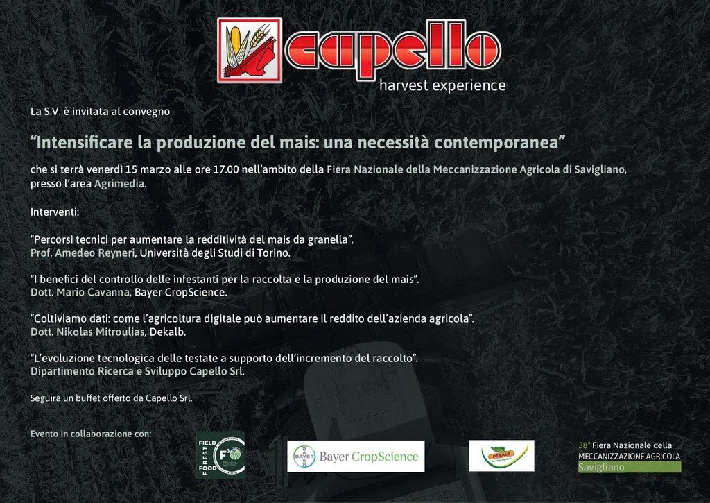 La Capello Srl, in questa edizione numero 38 della Fiera Nazionale della Meccanizzazione di Savigliano, propone un interessante convegno presso l’area Agrimedia. Il titolo dell’incontro è: “Intensificare la produzione del mais: una necessità contemporanea” che rivela subito come il mais, prodotto principe dei cereali, per cui le testate della Capello Srl sono conosciute in tutti i mercati e i campi del mondo, è al centro di questo dibattito. Quali sono le strade per intensificare la produzione del mais e quindi aumentare il valore finale del raccolto? Per dare una risposta esaustiva la Capello Srl ha chiamato alcune delle voci più autorevoli del settore, a livello nazionale e internazionale. Infatti, ad aprire l’incontrò sarà Amedeo Reyneri, professore ordinario del dipartimento di Scienze Agrarie, Forestali e Alimentari dell’Università di Torino, profondo conoscitore del settore agronomico, che analizzerà a fondo alcuni percorsi tecnici per aumentare la redditività del mais da granella. In questo percorso lo affiancheranno il dott. Mario Cavanna, della Bayer CropScience e il dott. Nikolas Mitroulias, della Dekalb, i quali mostreranno come lo studio dei dati raccolti dalle nuove tecnologie porti ad una maggiore conoscenza delle potenzialità inutilizzate del proprio terreno e non solo. A concludere il dibattito l’ing. Andrea Capello, responsabile della divisione Ricerca e Sviluppo della Capello Srl, che evidenzierà come la tecnologia delle testate a mais si è mossa per supportare l’incremento del raccolto. Un convegno aperto a tutti, dagli addetti ai lavori agli appassionati di agronomia.
