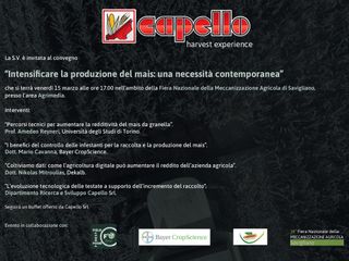 La Capello Srl, in questa edizione numero 38 della Fiera Nazionale della Meccanizzazione di Savigliano, propone un interessante convegno presso l’area Agrimedia. Il titolo dell’incontro è: “Intensificare la produzione del mais: una necessità contemporanea” che rivela subito come il mais, prodotto principe dei cereali, per cui le testate della Capello Srl sono conosciute in tutti i mercati e i campi del mondo, è al centro di questo dibattito. Quali sono le strade per intensificare la produzione del mais e quindi aumentare il valore finale del raccolto? Per dare una risposta esaustiva la Capello Srl ha chiamato alcune delle voci più autorevoli del settore, a livello nazionale e internazionale. Infatti, ad aprire l’incontrò sarà Amedeo Reyneri, professore ordinario del dipartimento di Scienze Agrarie, Forestali e Alimentari dell’Università di Torino, profondo conoscitore del settore agronomico, che analizzerà a fondo alcuni percorsi tecnici per aumentare la redditività del mais da granella. In questo percorso lo affiancheranno il dott. Mario Cavanna, della Bayer CropScience e il dott. Nikolas Mitroulias, della Dekalb, i quali mostreranno come lo studio dei dati raccolti dalle nuove tecnologie porti ad una maggiore conoscenza delle potenzialità inutilizzate del proprio terreno e non solo. A concludere il dibattito l’ing. Andrea Capello, responsabile della divisione Ricerca e Sviluppo della Capello Srl, che evidenzierà come la tecnologia delle testate a mais si è mossa per supportare l’incremento del raccolto. Un convegno aperto a tutti, dagli addetti ai lavori agli appassionati di agronomia.