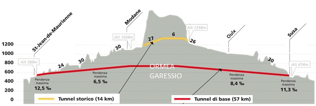 al Frejus la linea storica valica 1295 m slm, all’interno di un tunnel lungo 13,6 km;