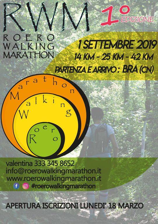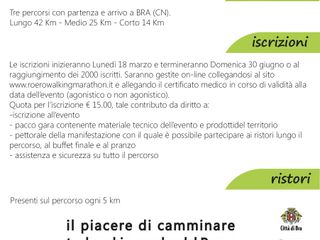 Dal 18 marzo sono partite le iscrizioni attraverso il sito www.roerowalkingmarathon.it, gestite dalla piattaforma Endu, e rimarranno aperte fino al 30 giugno; i primi amanti del cammino hanno già confermato la loro presenza al costo di 15 euro (comprensivi di pacco gara e ristori sui 3 percorsi) e al grido di ‘vietato correre’. ‘La RWM ha il gusto di un evento sportivo di grandi dimensioni’ – sostiene Christian Damasco, Presidente del Comitato UISP – ‘parteciparvi vuol dire far parte di quel popolo di camminatori che si appassiona al territorio e allo sport e che appoggia uno stile di vita sano e rispettoso dell’ambiente che ci circonda’.