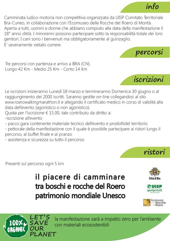 Bra, 19 marzo 2019 – Si terrà domenica 1 settembre la prima edizione della Roero Walking Marathon, una maratona per camminatori organizzata e gestita dal UISP – Comitato territoriale Bra – Cuneo con lo scopo di promuovere uno sport per tutti da praticare outdoor e per far conoscere un territorio ricco di bellezze naturalistiche che costituisce il patrimonio ambientale dei comuni interessati dall’evento riconosciuto dall’UNESCO.
