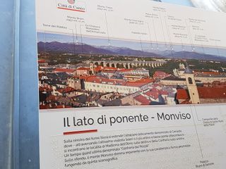 La cosa strana è che non si vede piazza Galimberti, coperta in prospettiva dai tetti delle case e dei palazzi. Però si vedono le montagne e le 40 torri mozzate che un tempo facevano di Cuneo una città simile ad Alba.